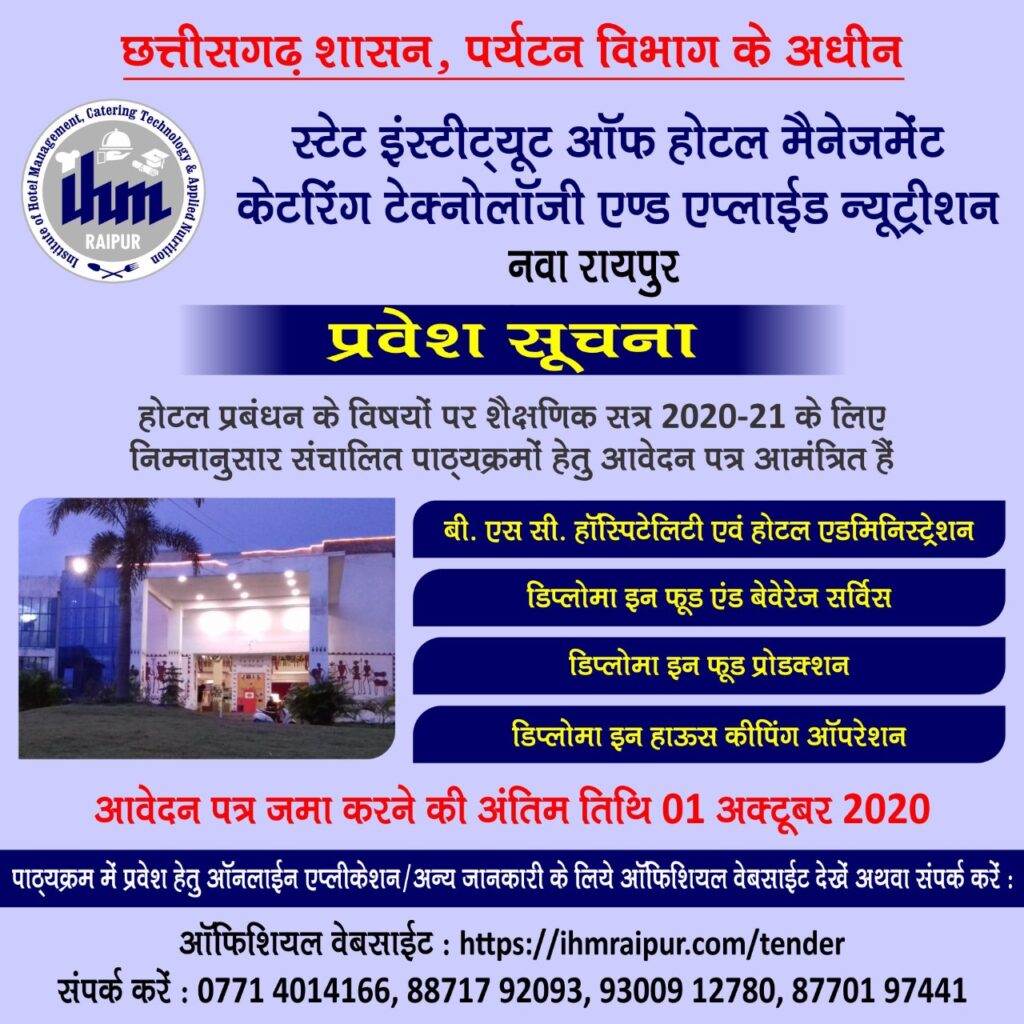 डिग्री एवं डिप्लोमा कोर्स हेतु विज्ञापन, नियम शर्ते, शैक्षणिक अर्हता, आवेदन पत्र एवं शैक्षणिक शुल्क की जानकारी वेबसाईट www.ihmraipur.com एवं