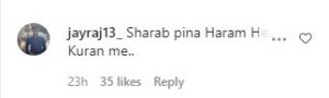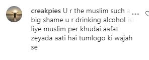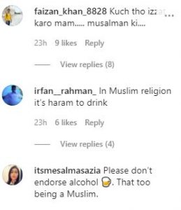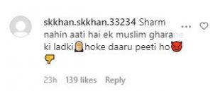 एक यूजर ने लिखा शर्म नहीं आती एक मुस्लिम घराने की लड़की होकर शराब पीती हो तो वहीं एक और यूजर ने लिखा, आप मुस्लिम हो और बड़ी शर्म की बात है कि आप शराब पी रही हो, इसलिए मुस्लिम पर खुदाई आफत ज्यादा आती हैं. आप भी देखिए लोगों के कमेंट्स