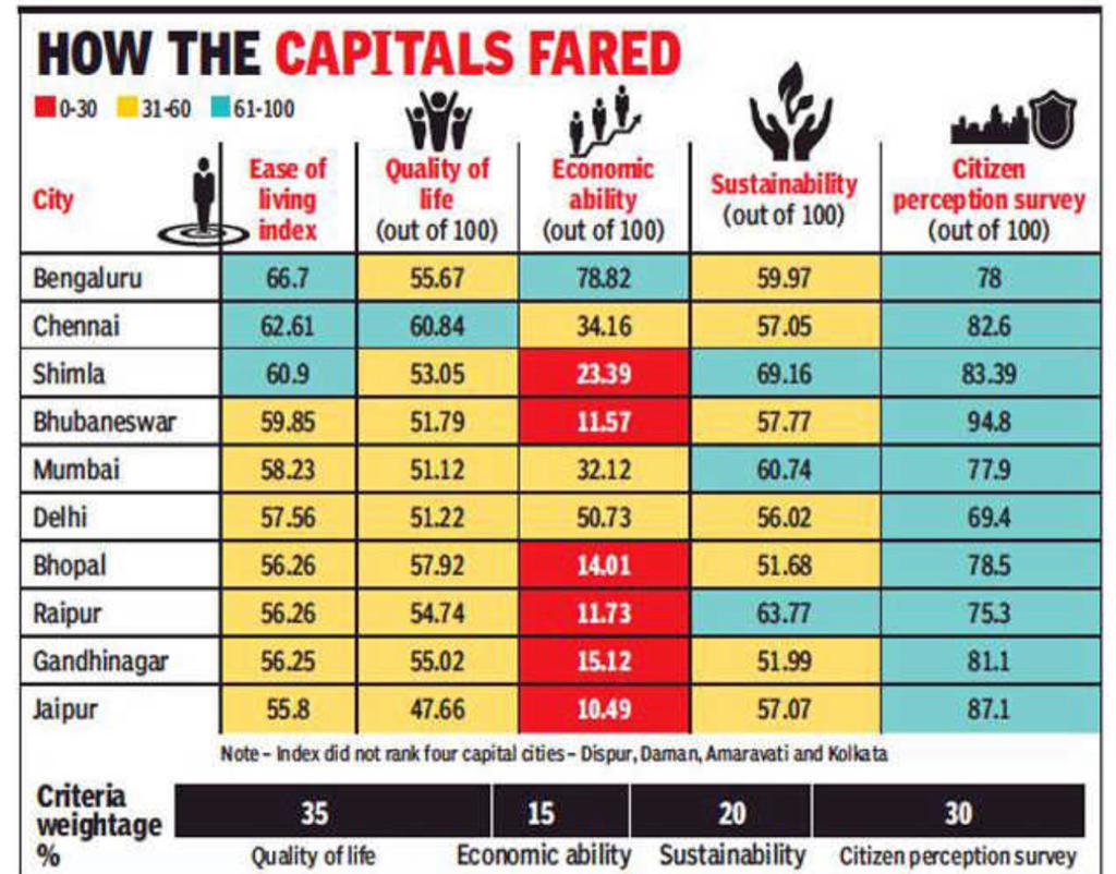 ईज ऑफ लिविंग इंडेक्स पर स्कोर निर्धारित करने के लिए, चार मापदंडों का उपयोग किया गया था: जीवन की गुणवत्ता, आर्थिक क्षमता, स्थिरता और नागरिकों की धारणा। रिपोर्ट में भारत के राज्यों की राजधानियाँ उस राज्य के विकास का एक अच्छा संकेत दे रही है। सेंटर फॉर साइंस एंड एनवायरनमेंट द्वारा जारी एक नई रिपोर्ट ने भी यह वास्तव में स्थापित किया है कि देश में कौन सी राज्य की राजधानियाँ भारत के सबसे अधिक रहने योग्य शहरों में से हैं।