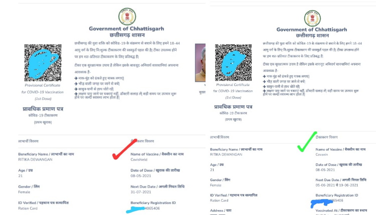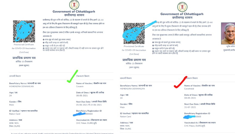 रायपुर (खबर वारियर) छत्तीसगढ़ भाजपा विधायक दल के स्थायी सचिव जितेंद्र वर्मा ने बताया कि पाटन विधानसभा क्षेत्र के प्राथमिक स्वास्थ्य केंद्र पाटन में 08 मई 2021 को आजाद चौक पाटन निवासी हेमेंद्र देवांगन और रितिका देवांगन ने 18 प्लस वैक्सीनेशन श्रेणी अंतर्गत वैक्सीन लगवाया, जिन्हें उनके मोबाइल नंबर पर सर्टिफिकेट प्राप्त हुआ, जिसमें दोनों व्यक्तियों को कोविशिल्ड एवं को-वैक्सीन दोनो वैक्सीन लगने के अलग-अलग प्रमाण पत्र प्राप्त हुए है ।